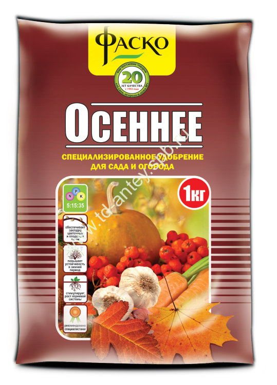 Удобрение предназначено для плодовых и декоративных деревьев, кустарников, а также луковичных культур. Способствует хорошей приживаемости саженцев, формированию мощной корневой системы и полному вызреванию.